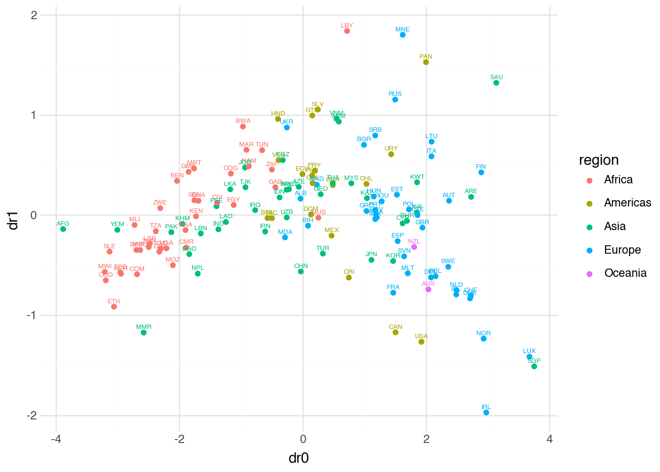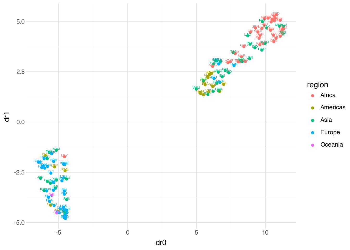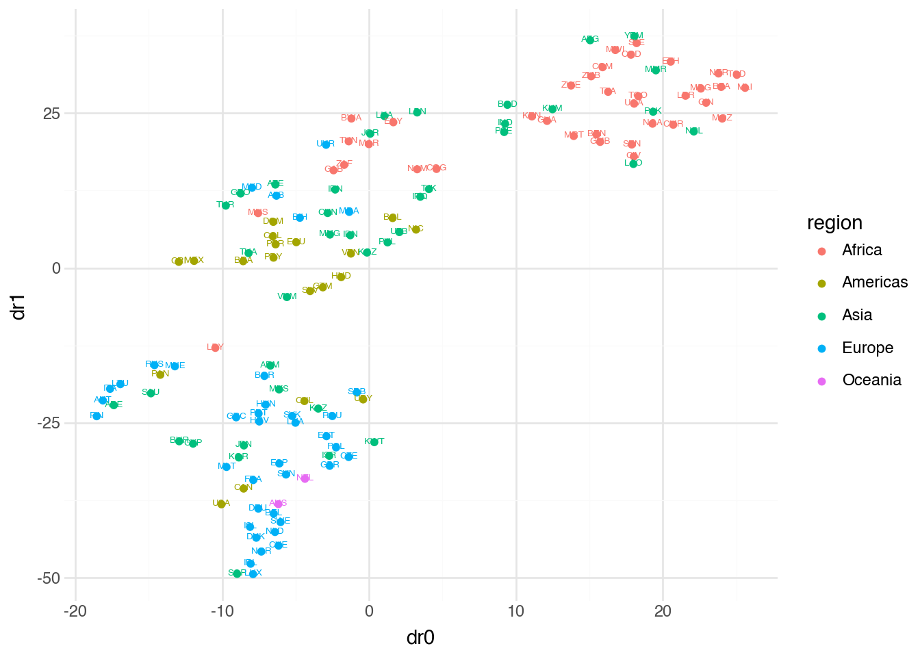With the components added to our data, we can create a visualization that projects all 188 countries into two dimensions while preserving information about their region and identity. This type of plot reveals structure that would be impossible to see by examining the four original variables separately.
