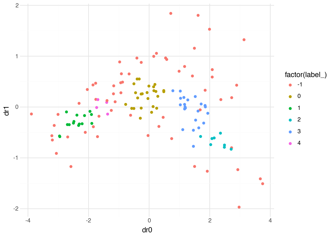 We can visualize the DBSCAN results using the same approach we used for k-means: cluster in the original space, then project to two dimensions for plotting.