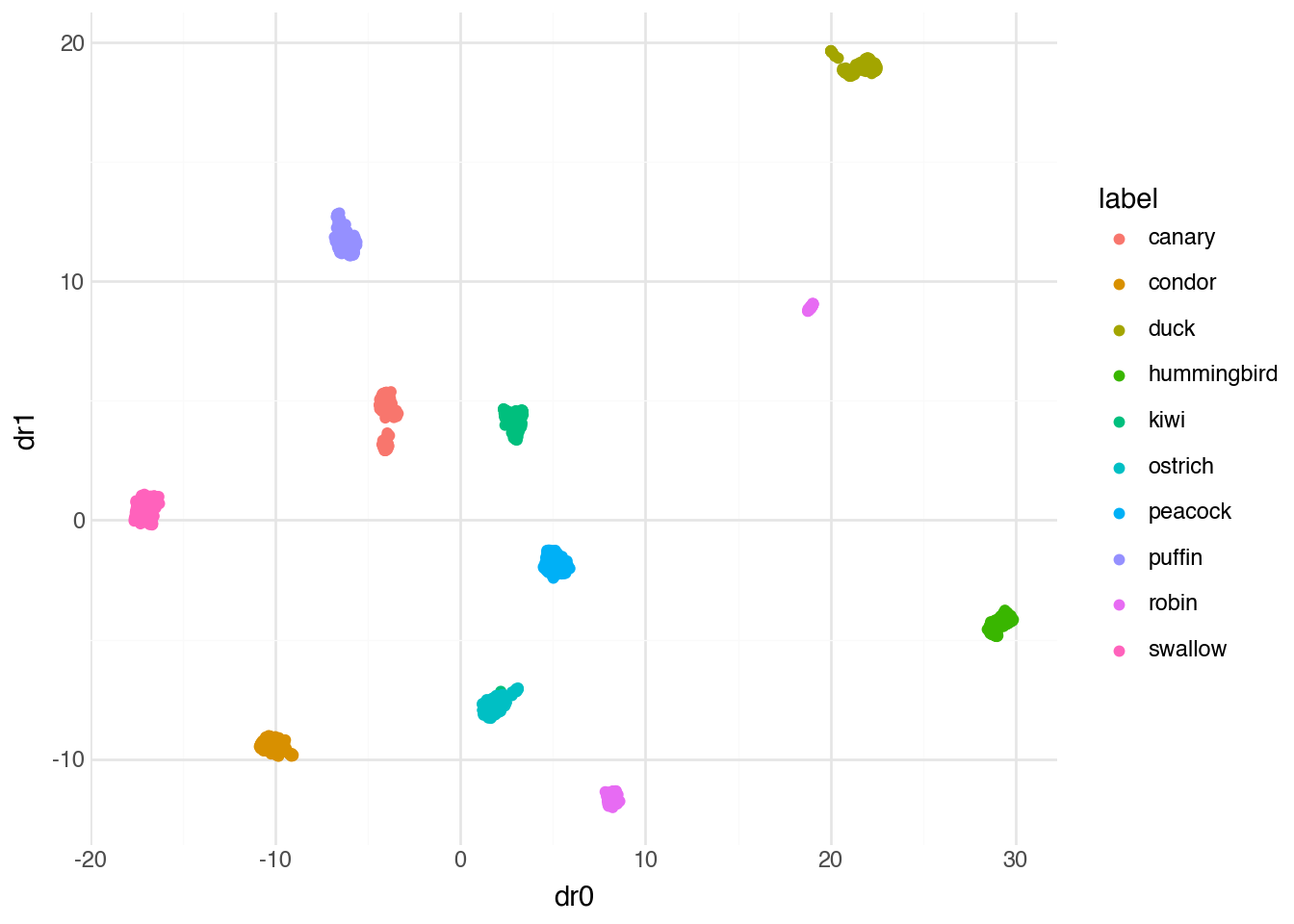 )Beyond classification, embeddings can also be visualized to understand the structure of our data. Dimensionality reduction techniques like UMAP (Uniform Manifold Approximation and Projection) can project the 768-dimensional embeddings down to two dimensions while preserving the relative distances between points. This allows us to see how the different bird species cluster in the embedding space.