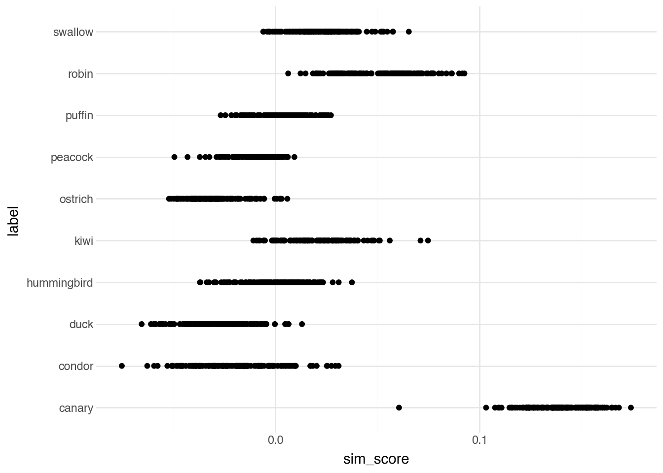 Visualizing the similarity scores by bird species shows that canary images indeed have the highest similarity to our “a photo of a canary” text prompt. This demonstrates that the model has learned a meaningful connection between the visual appearance of canaries and the word “canary” without us ever explicitly teaching it this connection.