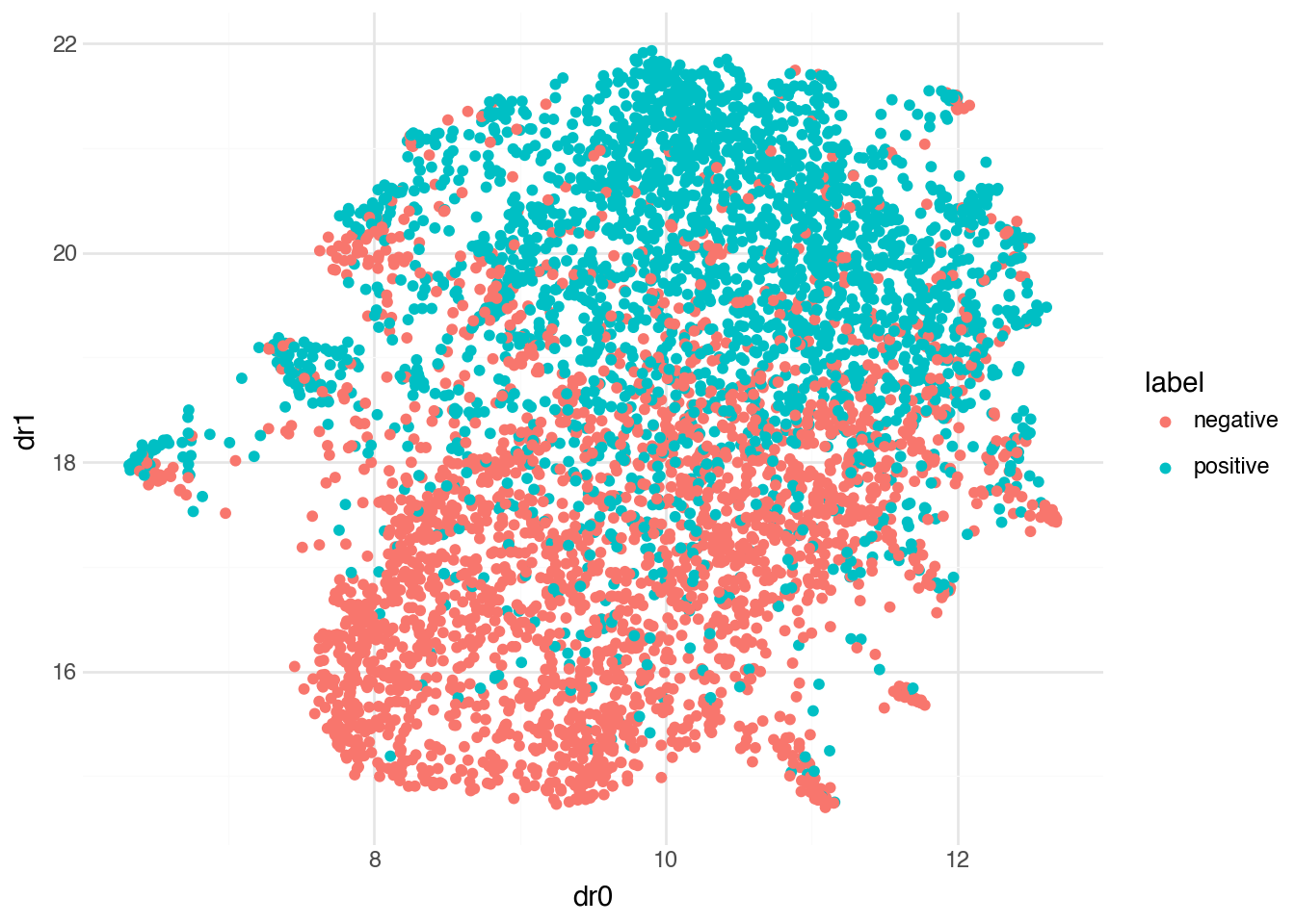 As with the bird images, we can visualize the embedding space using UMAP to see how positive and negative reviews cluster. Well-separated clusters indicate that the embeddings capture the sentiment distinction effectively.