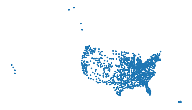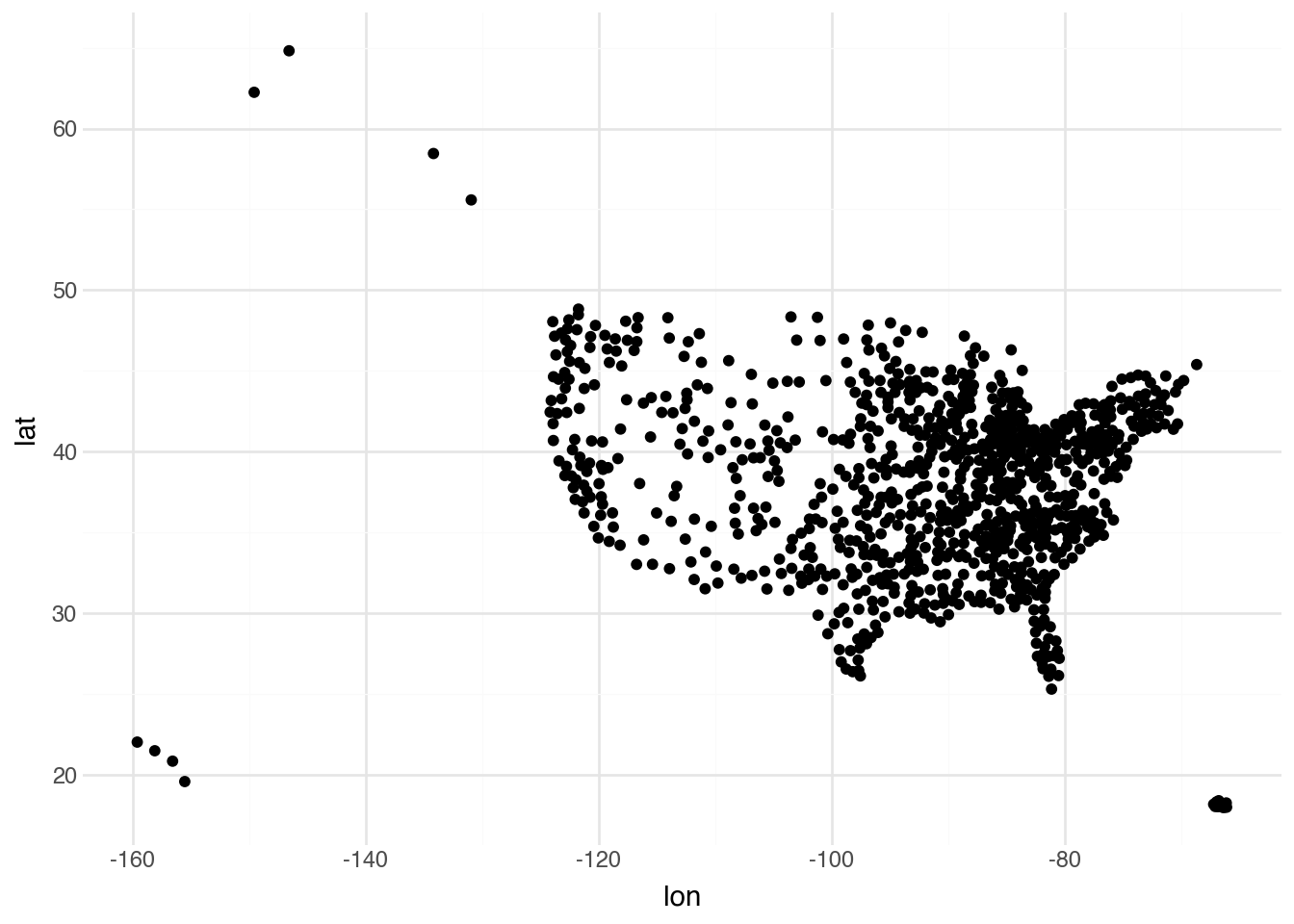 This scatter plot is functional but has several limitations. The most obvious is that it treats longitude and latitude as if they were ordinary Cartesian coordinates, when in fact they represent positions on a curved surface. The distortion is particularly noticeable at higher latitudes, where equal increments in longitude correspond to shorter physical distances. Additionally, we have no context for these points: no coastlines, state boundaries, or other geographic features to help orient the viewer.