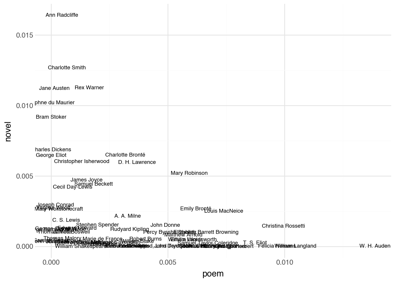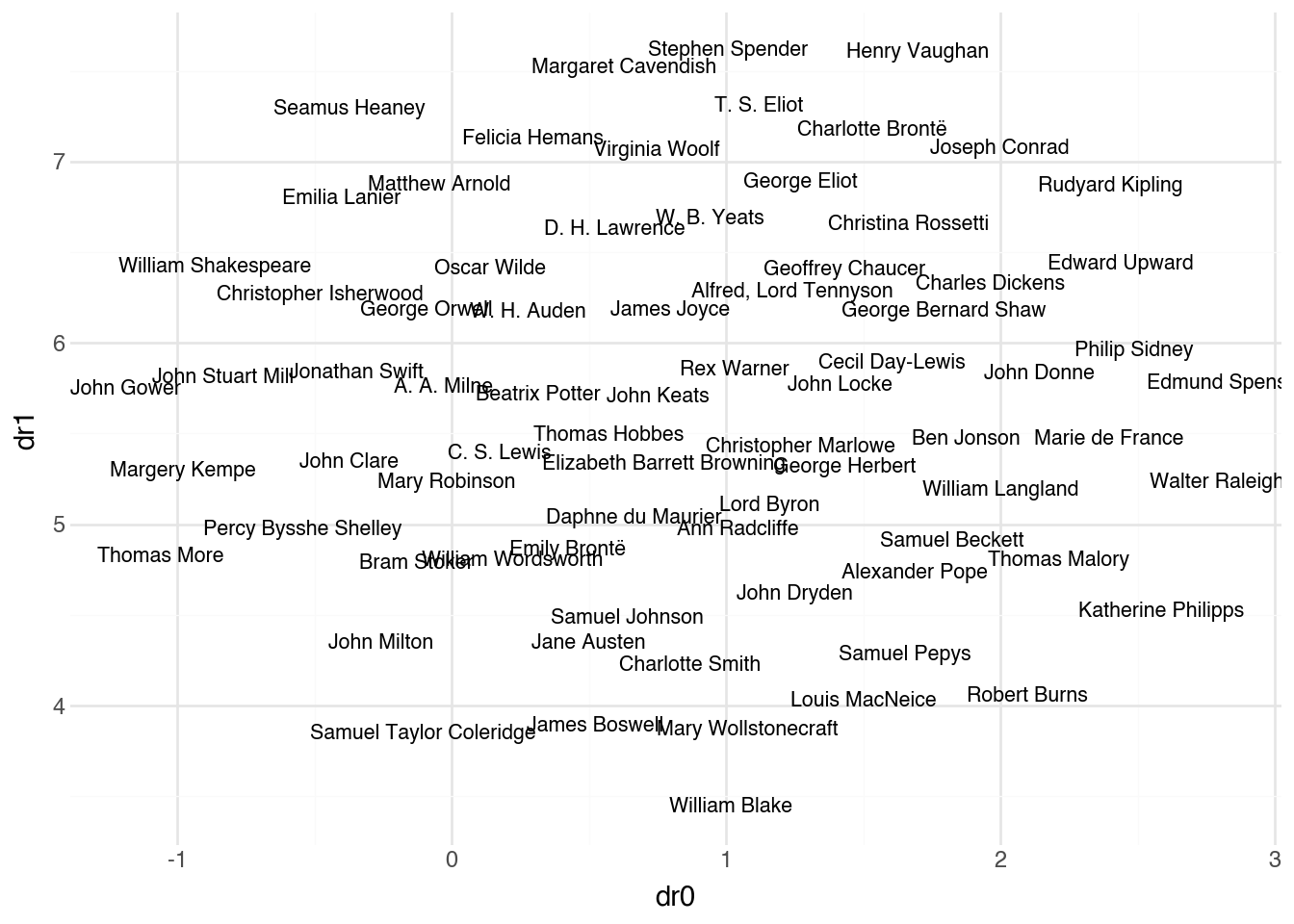)In this two-dimensional view, the position of each document tells us something meaningful. Authors whose Wikipedia pages discuss poetry extensively appear far to the right. Those whose pages focus on novels appear near the top. Authors associated with both forms sit in the upper-right region, while those associated with neither sit near the origin. Documents that are close together in this space have similar usage patterns for these two terms.
